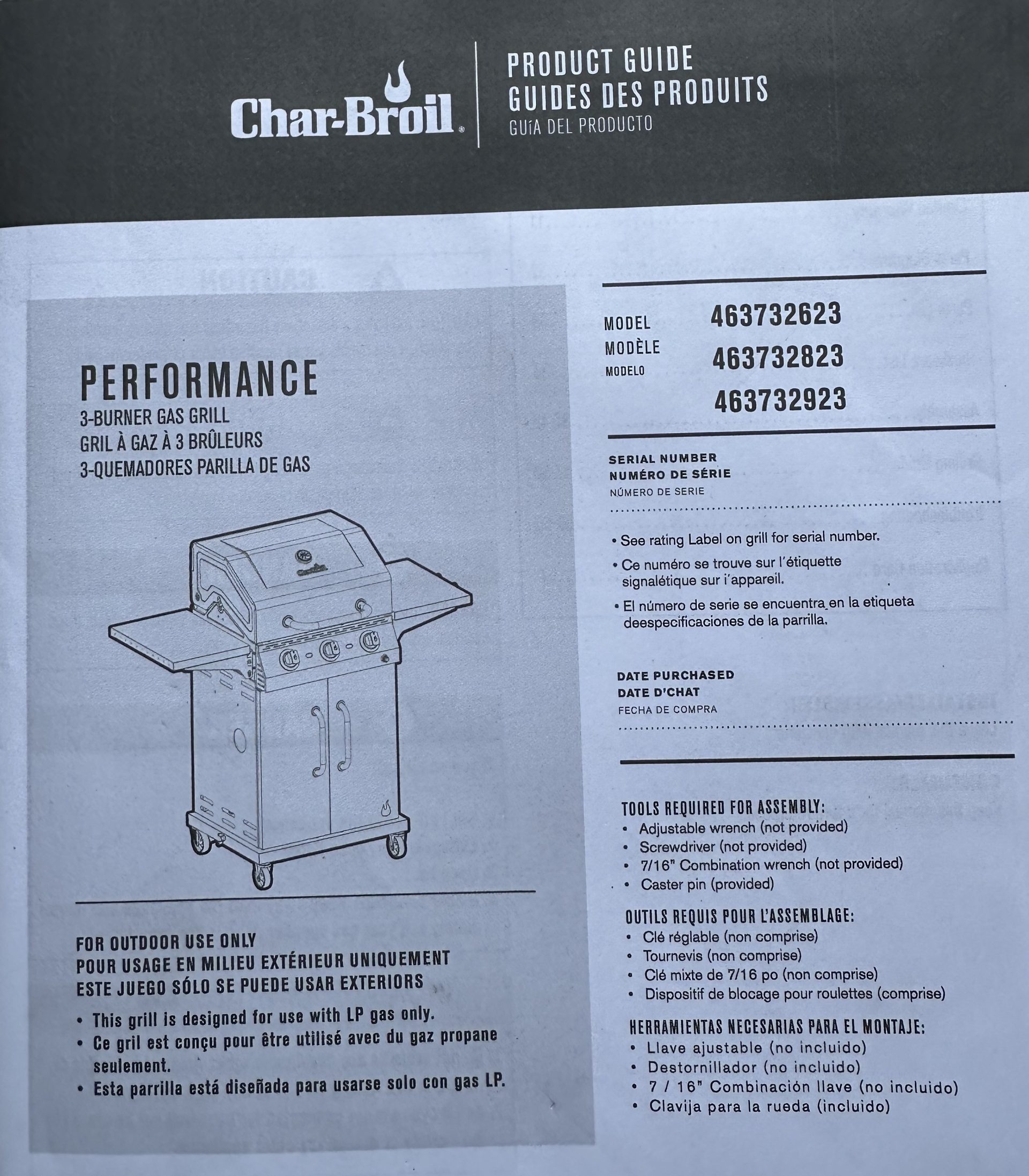 Char-Broil Performance 3-burner gas grill. Model 463732623