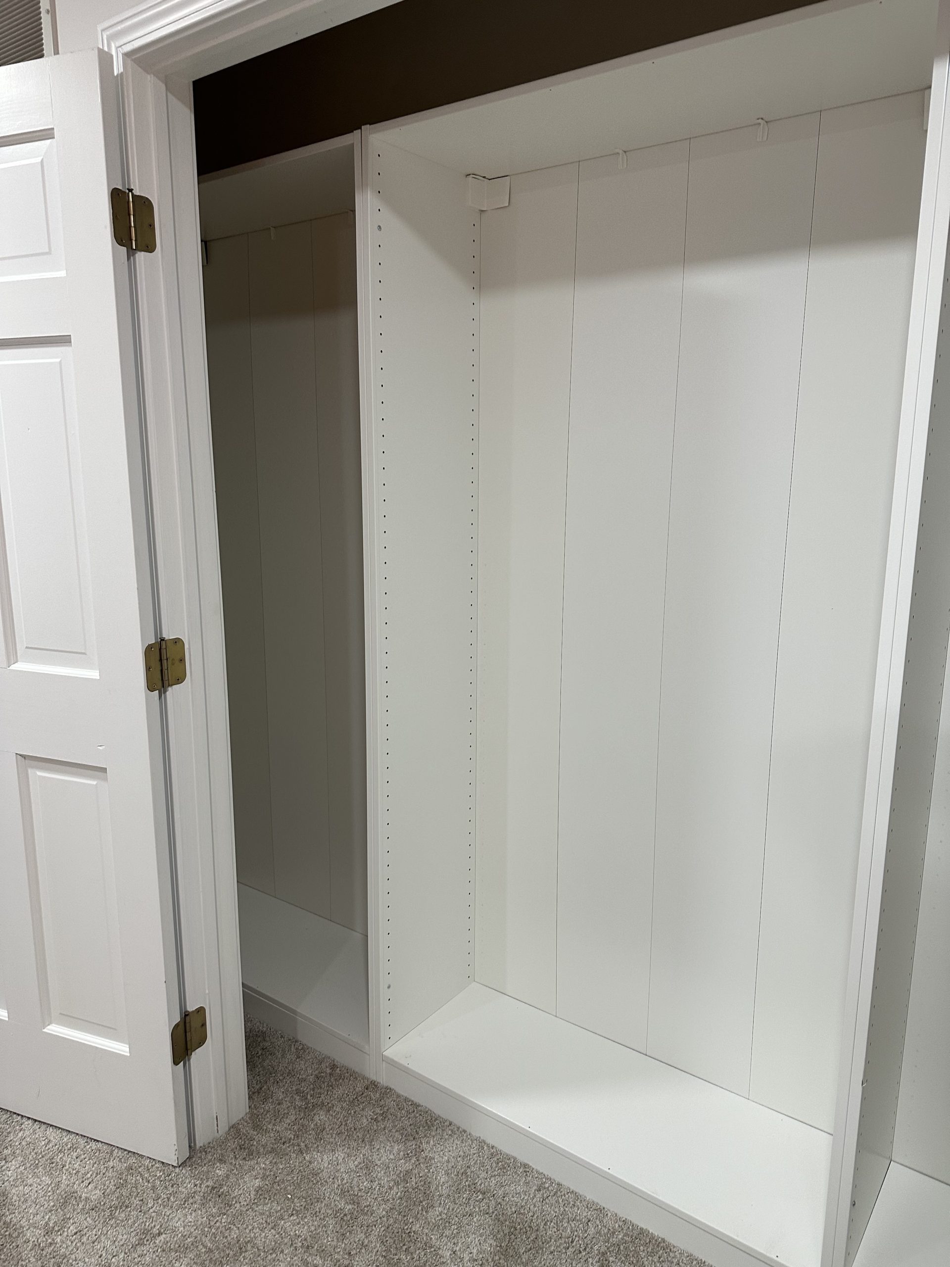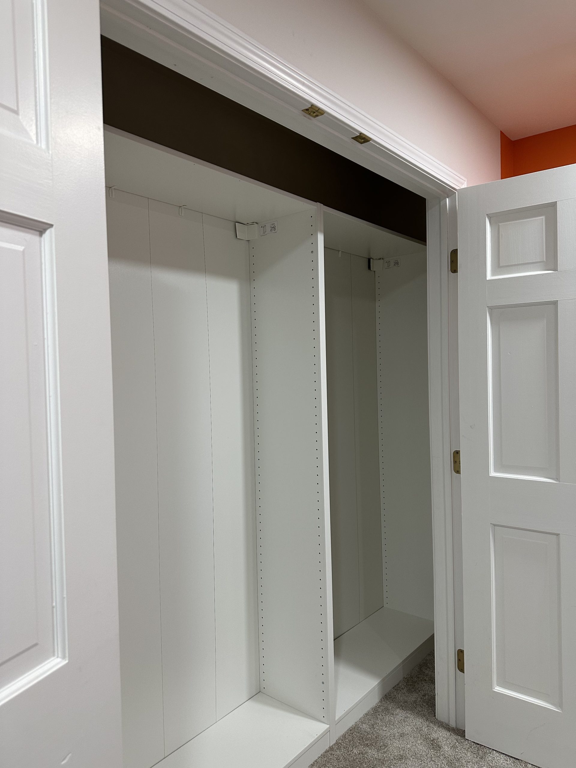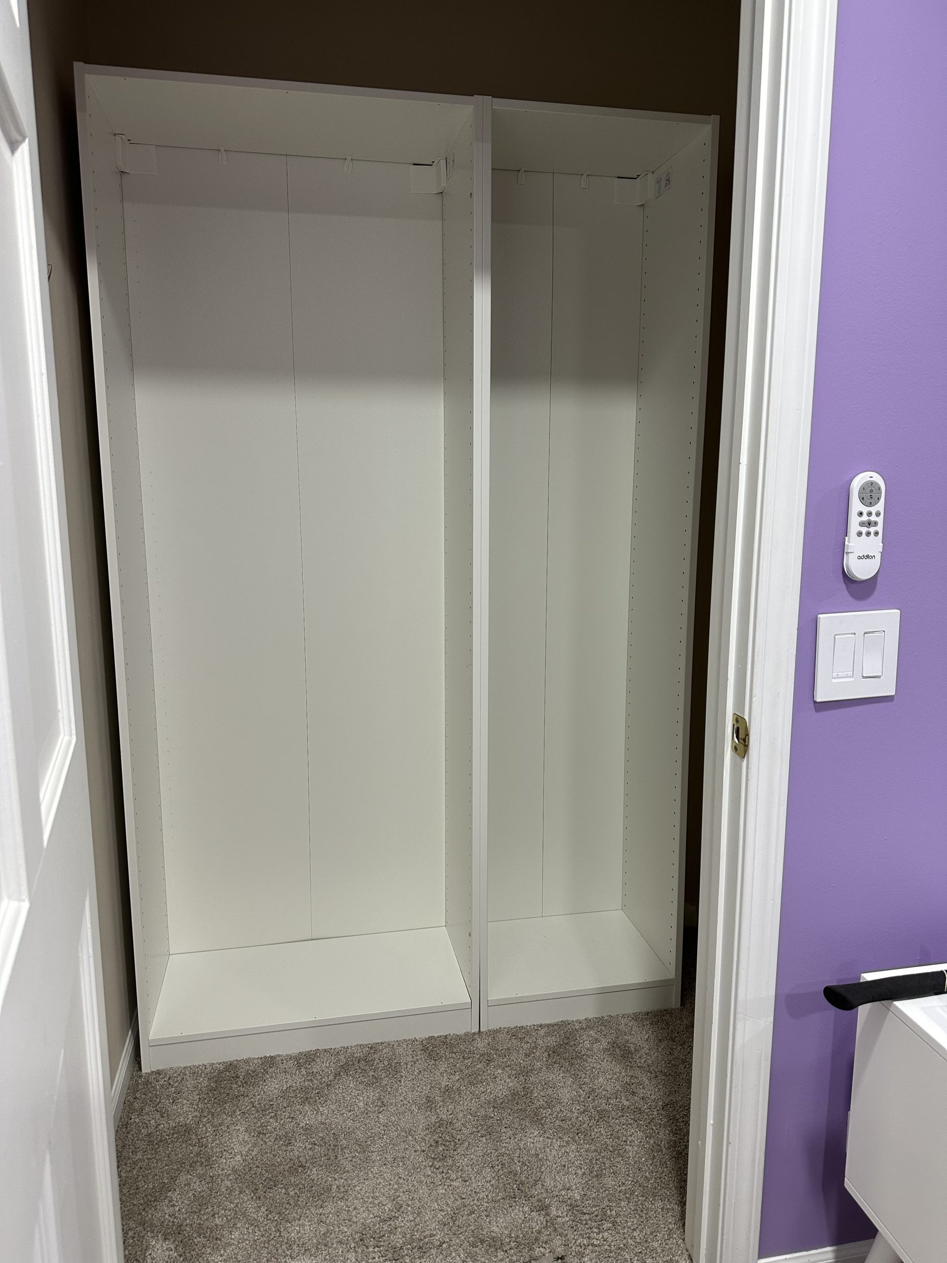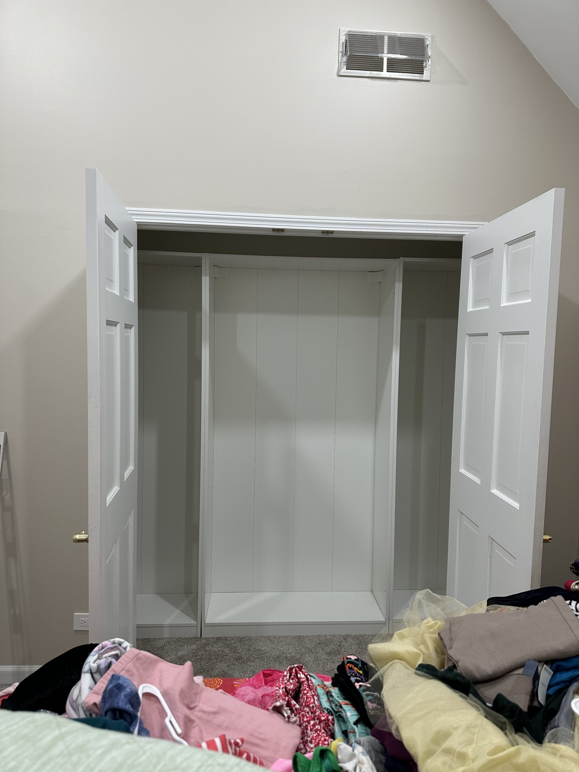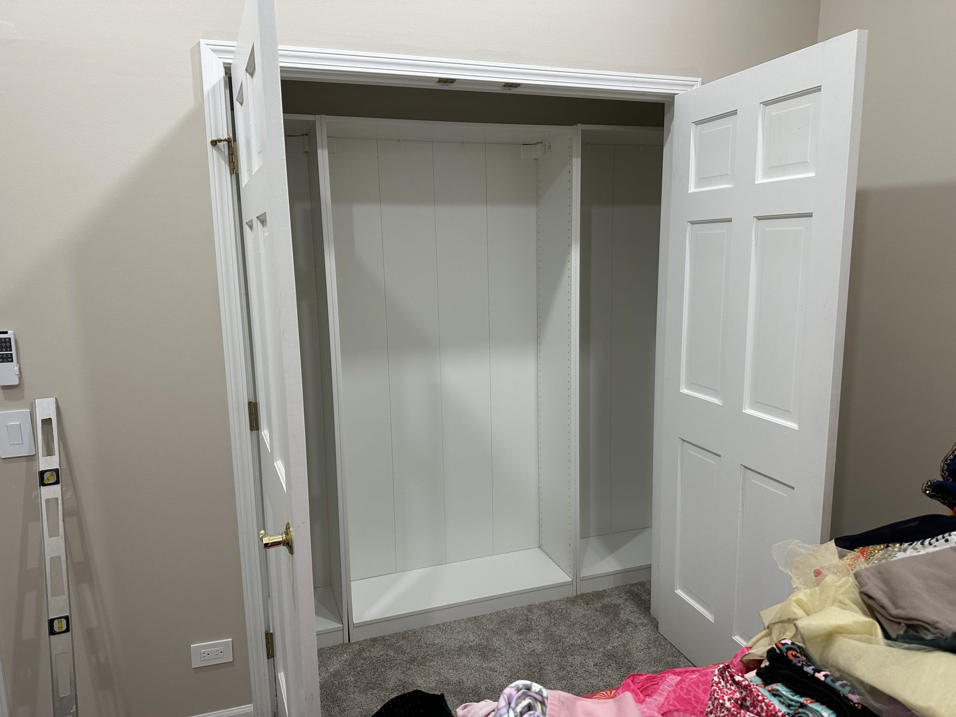 Assemble all cabinet frames within three different closets. 3 large ones in the primary bedroom. 1 large and 2 medium ones in a second bedroom. And 1 medium and 1 small in a third bedroom.