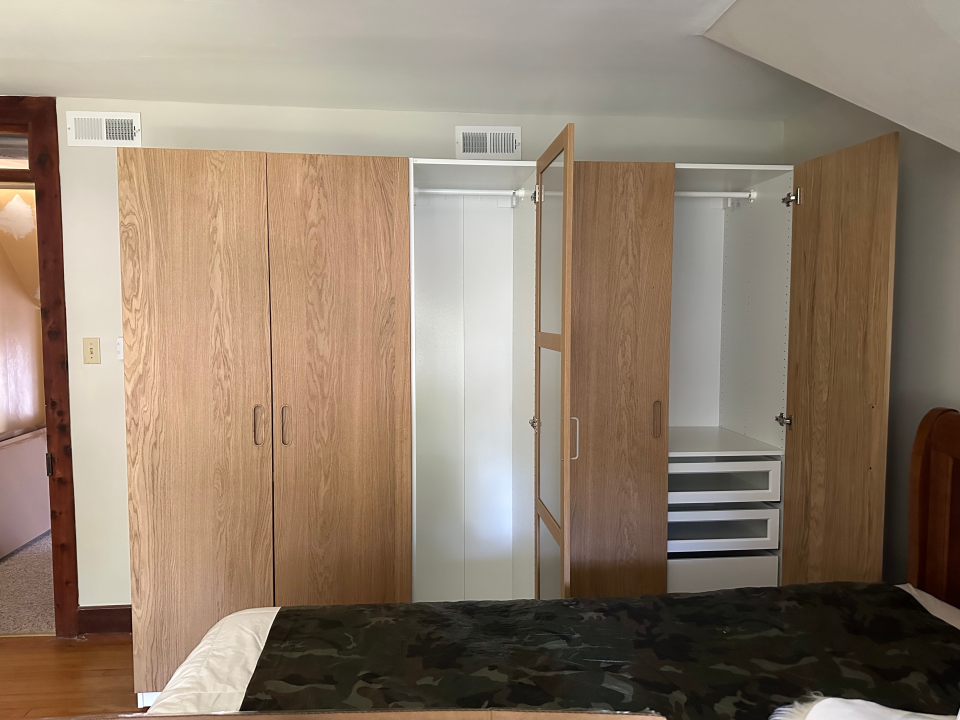 Assembly of two large IKEA PAX frames and one medium frame, plus a variety of clothes rails, drawers, pull-out baskets, and doors