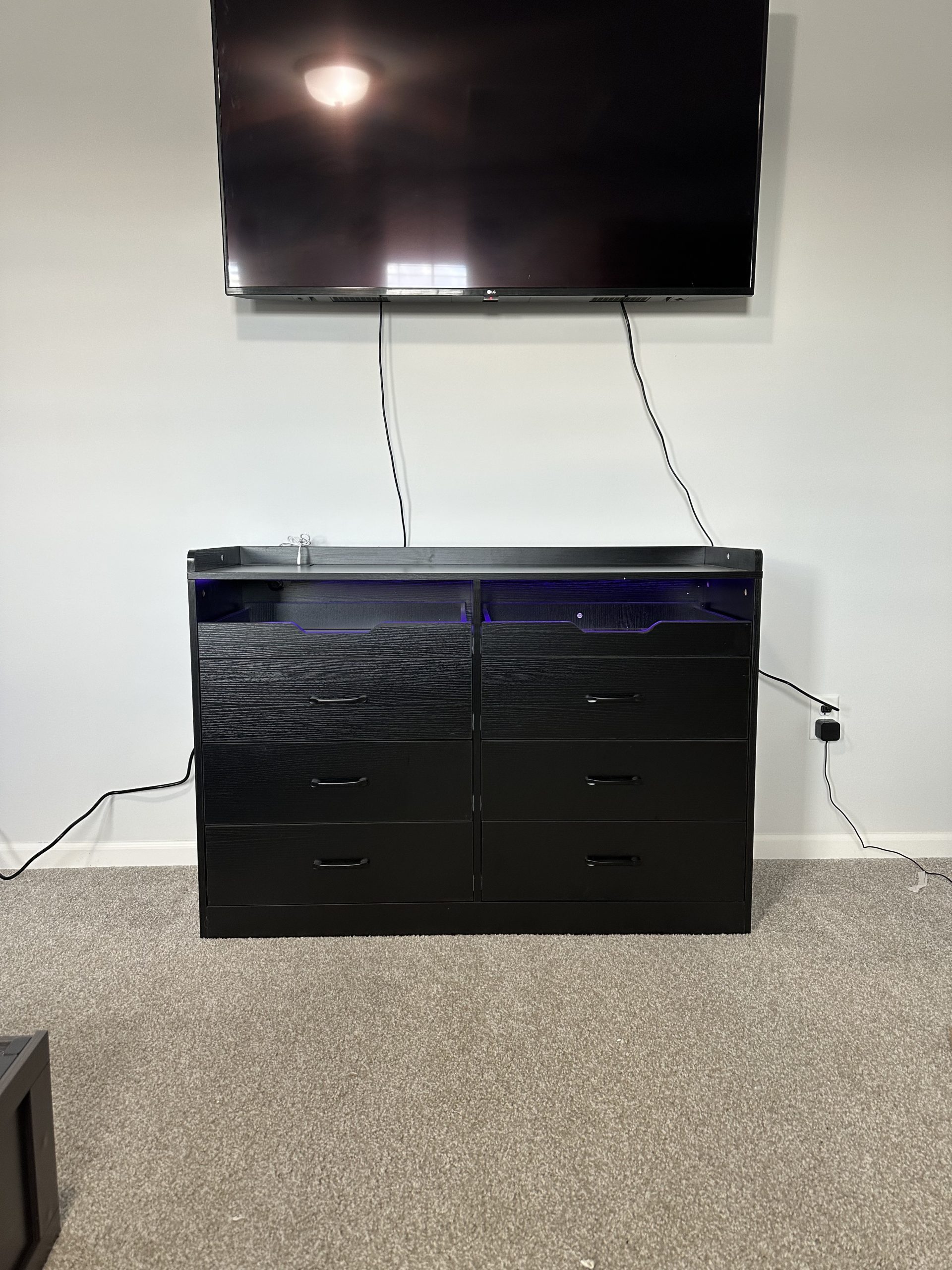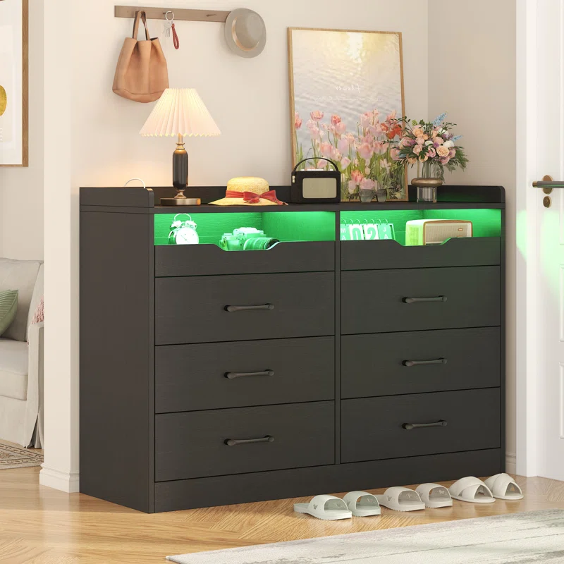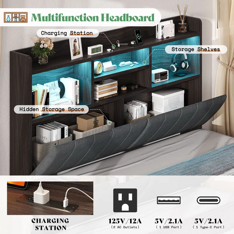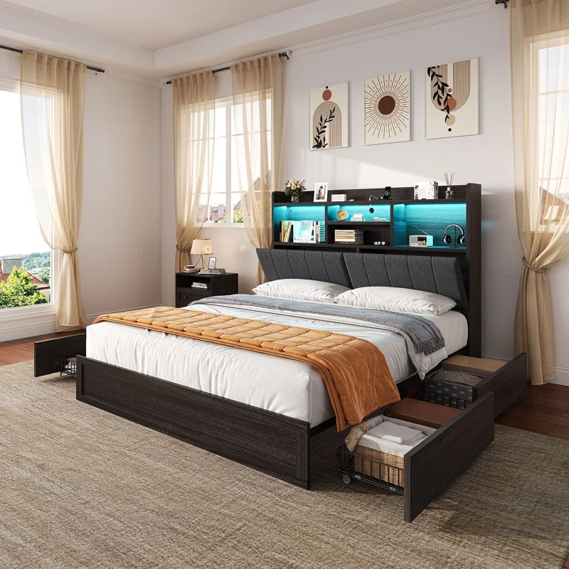 Bed: Ivy Bronx Farmhouse Bed with LED Bookcase Headboard, 4 Storage Drawers & Charging Station. Two Ivy Bronx 17.7" Nightstands. Ivy Bronx Nadesh 6-drawer dresser.