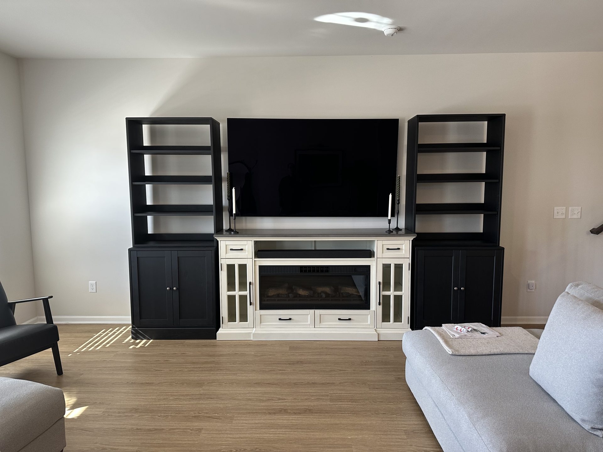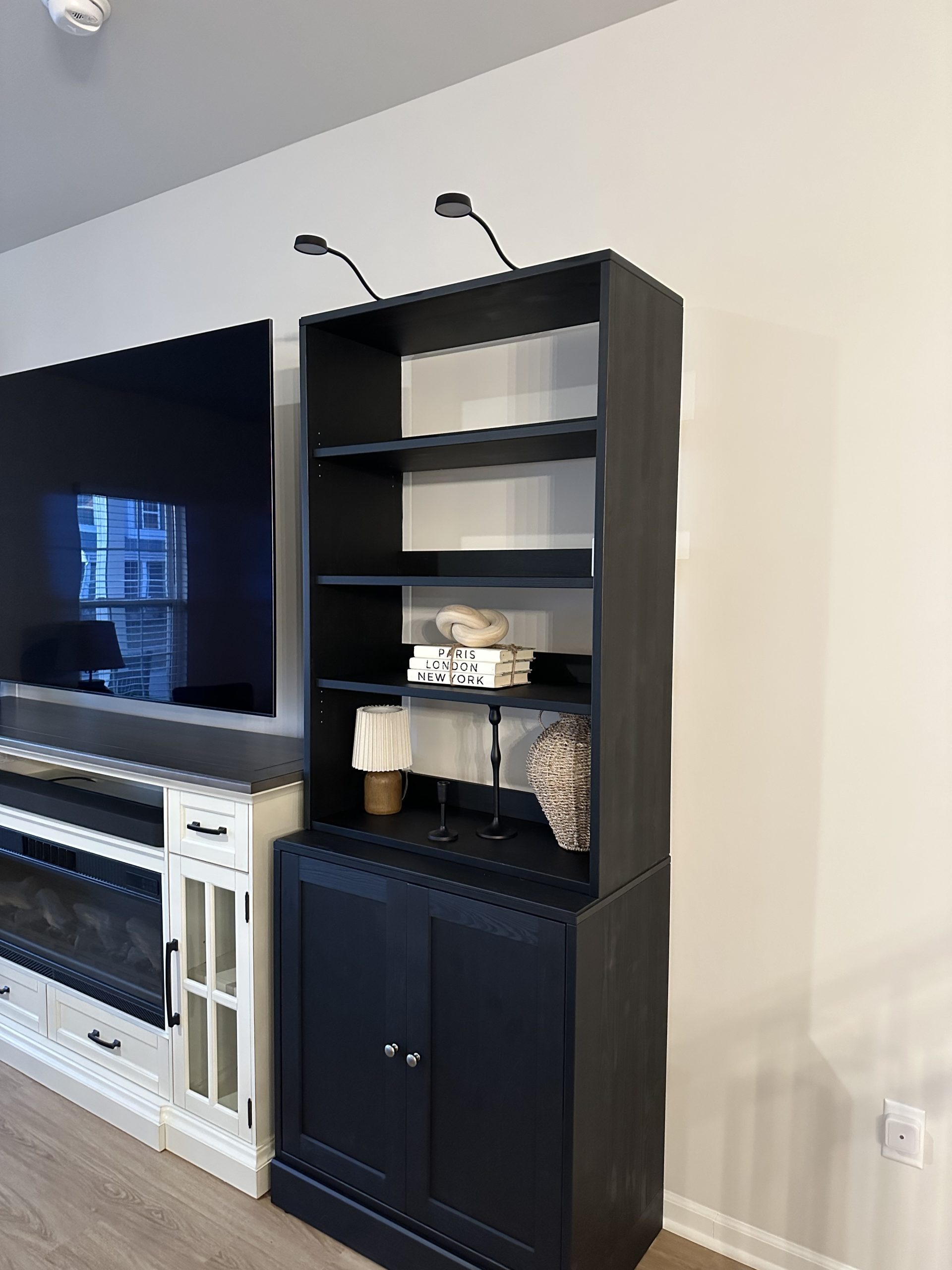 Two pairs of IKEA YTBERG cabinet lights were attached to the tops of the shelving units. Then the wires were run down the edges of the cabinets out of view. Finally, the wires were connected to an IKEA TRADFRI hub that can be controlled by a RODRET remote control and dimmer