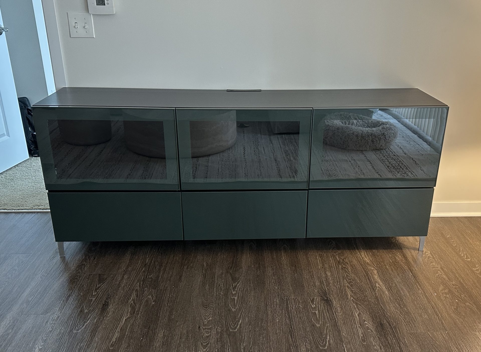 IKEA BESTA tv unit, shelves, and drawers. SELSVIKEN drawer fronts and GLASSVIK glass doors. NANNARP support legs.