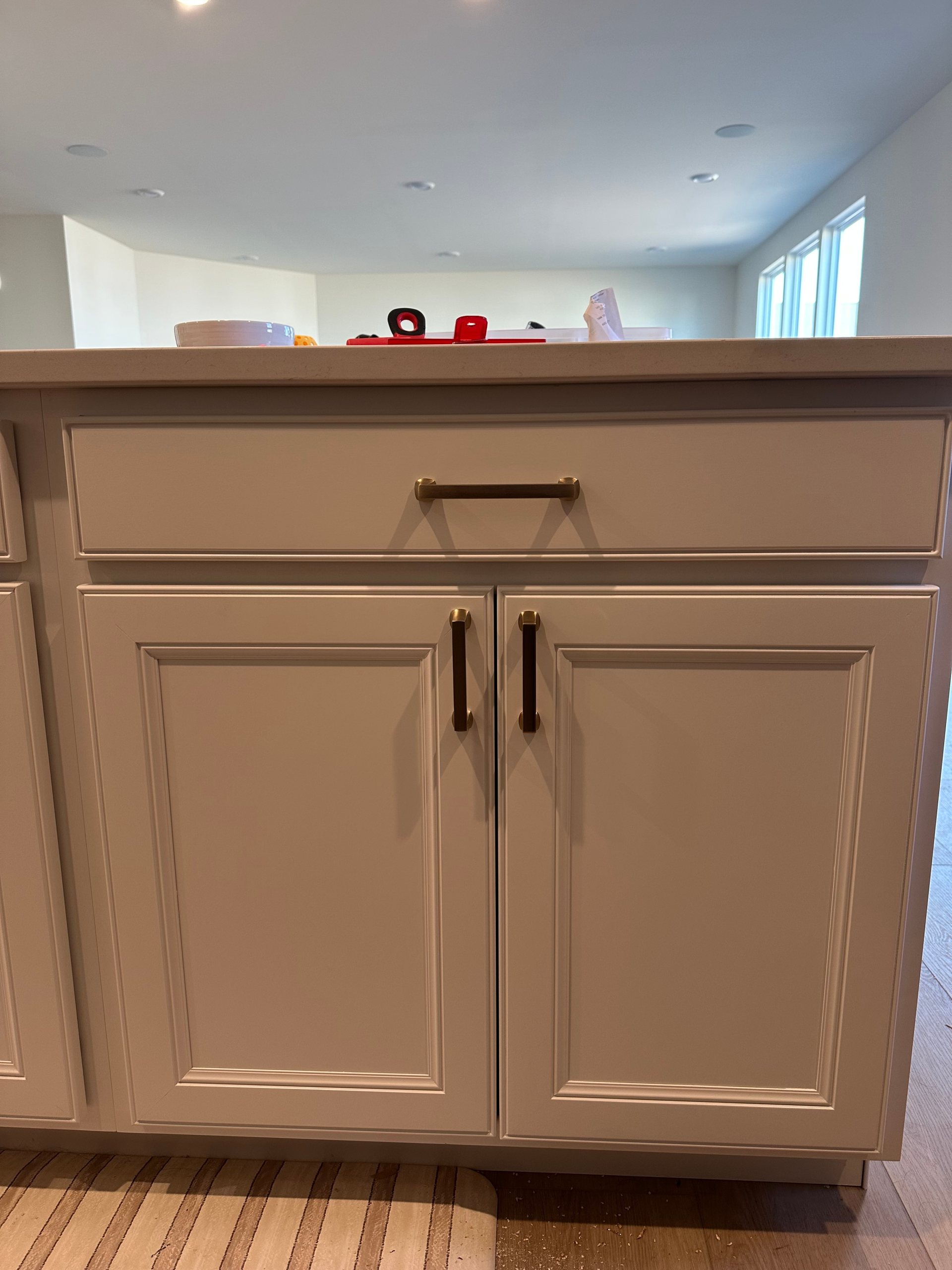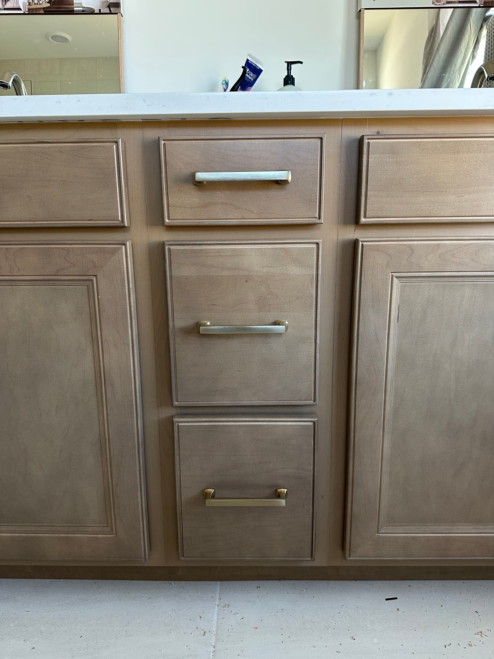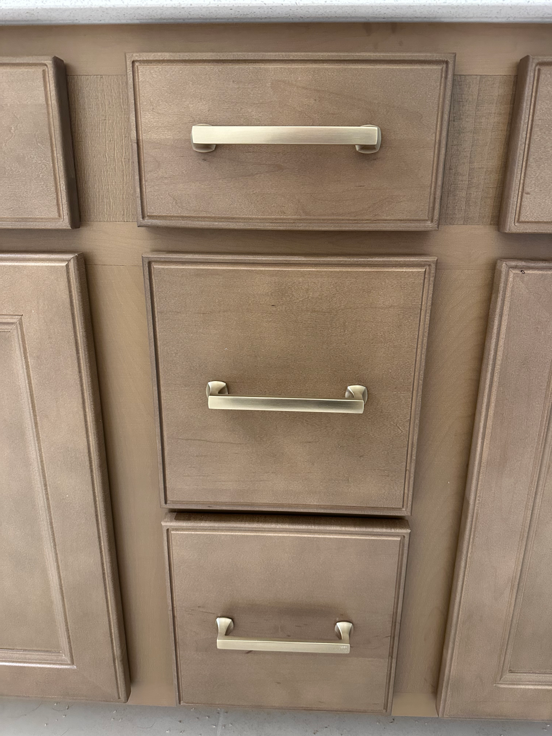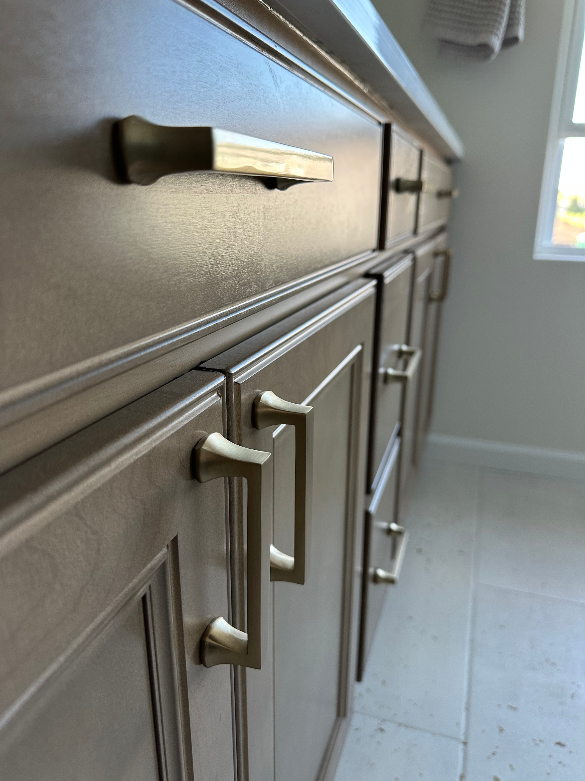 Install 58 cabinet handles and pulls in a kitchen and two bathrooms