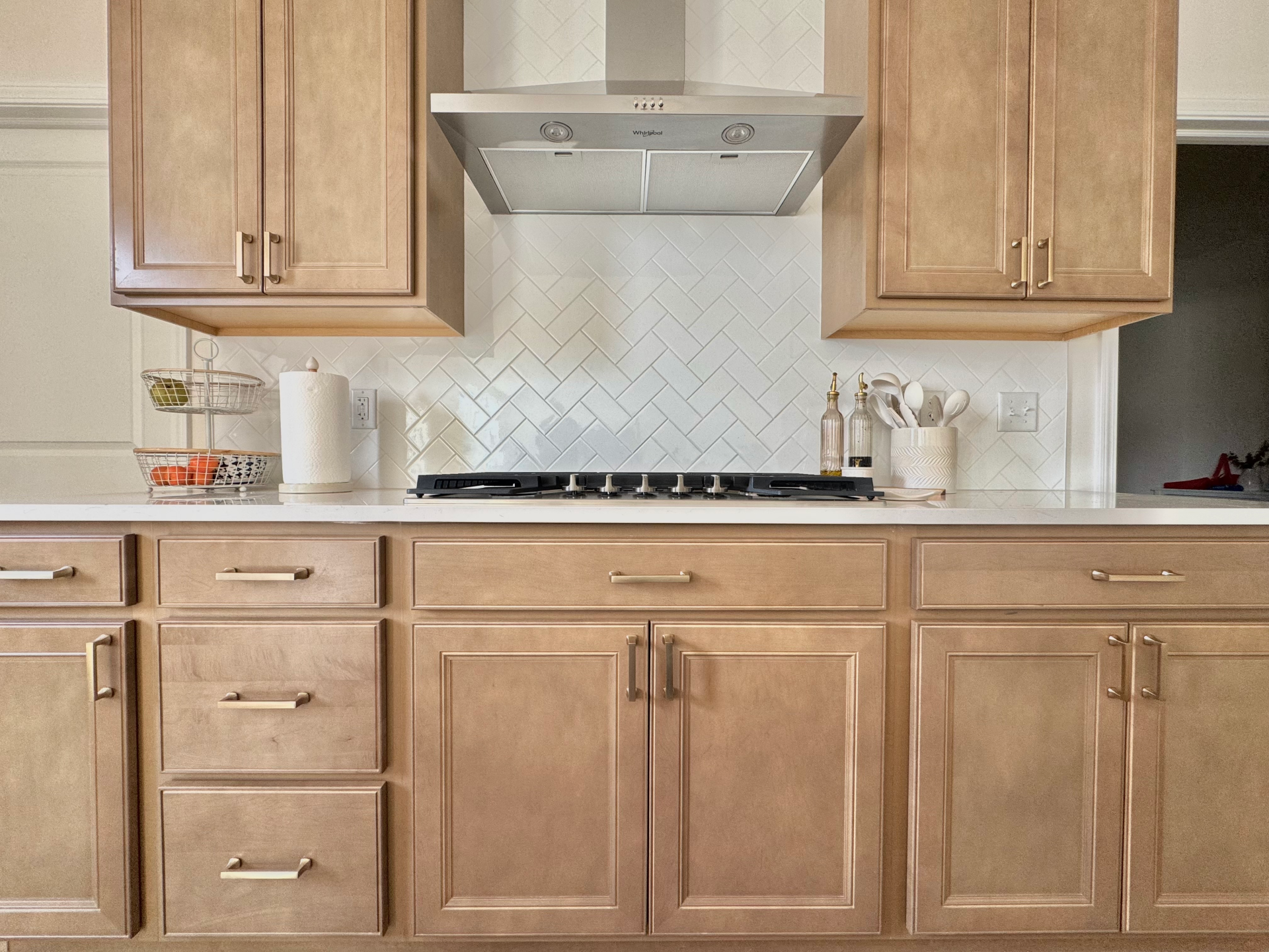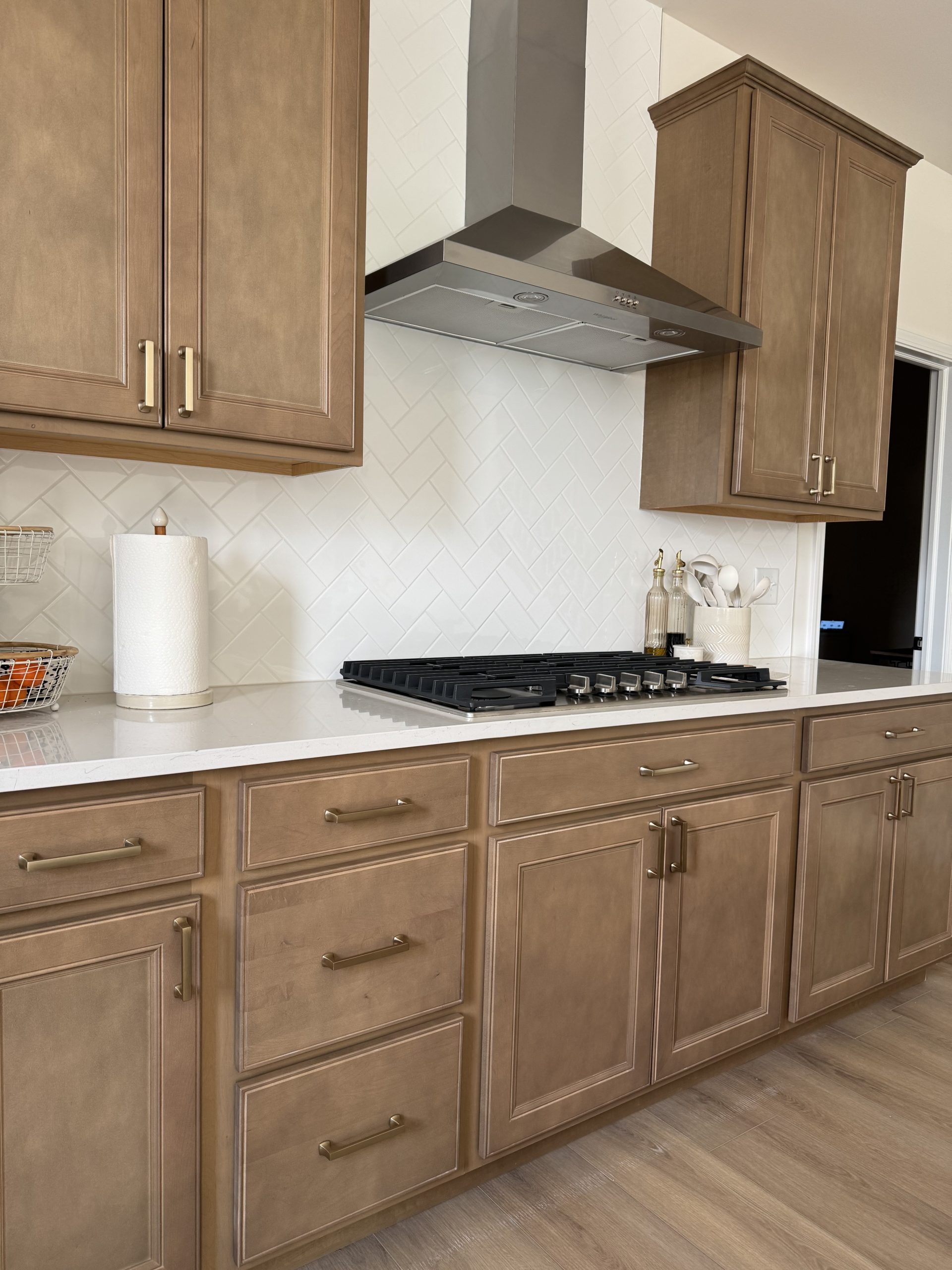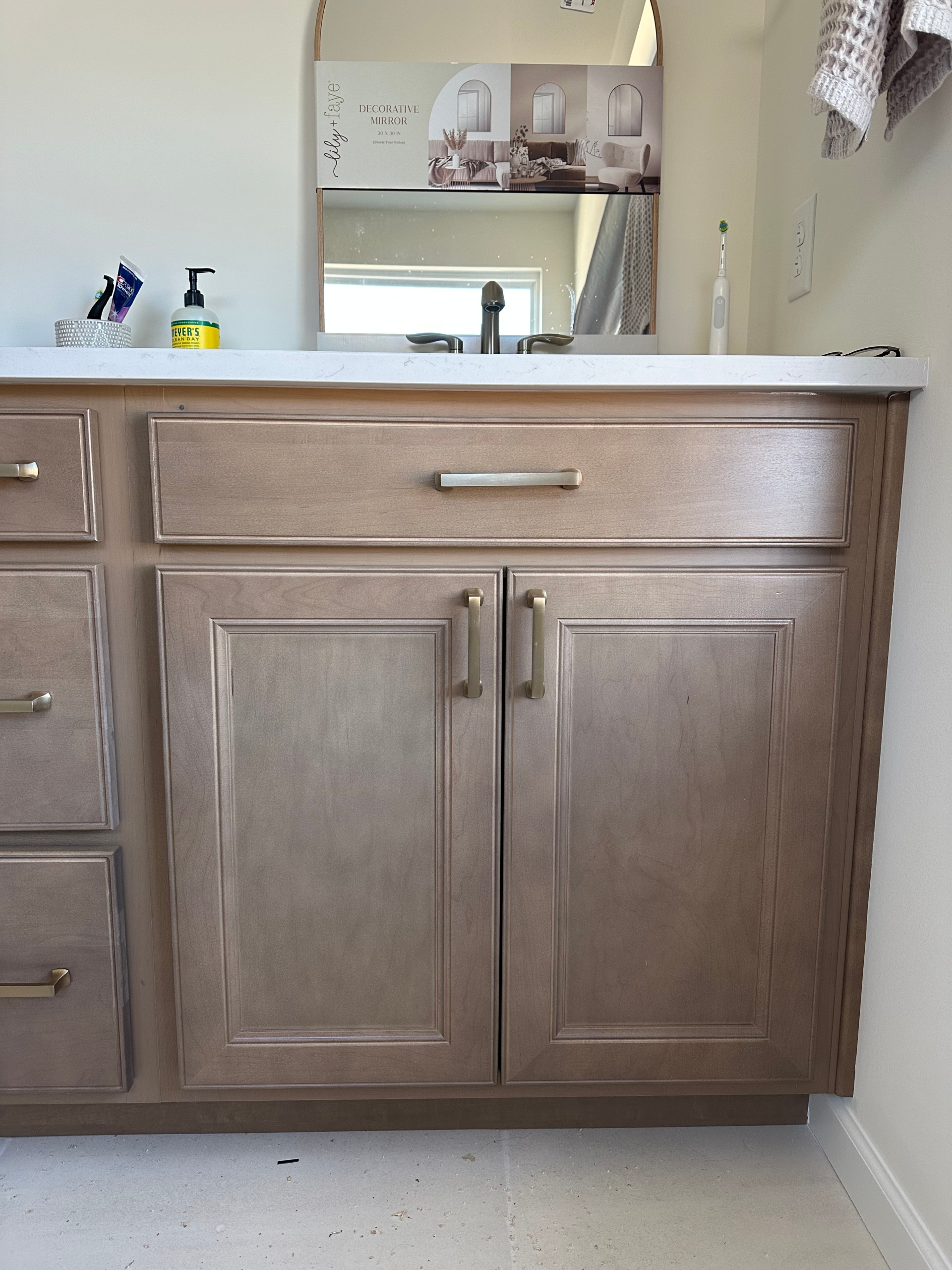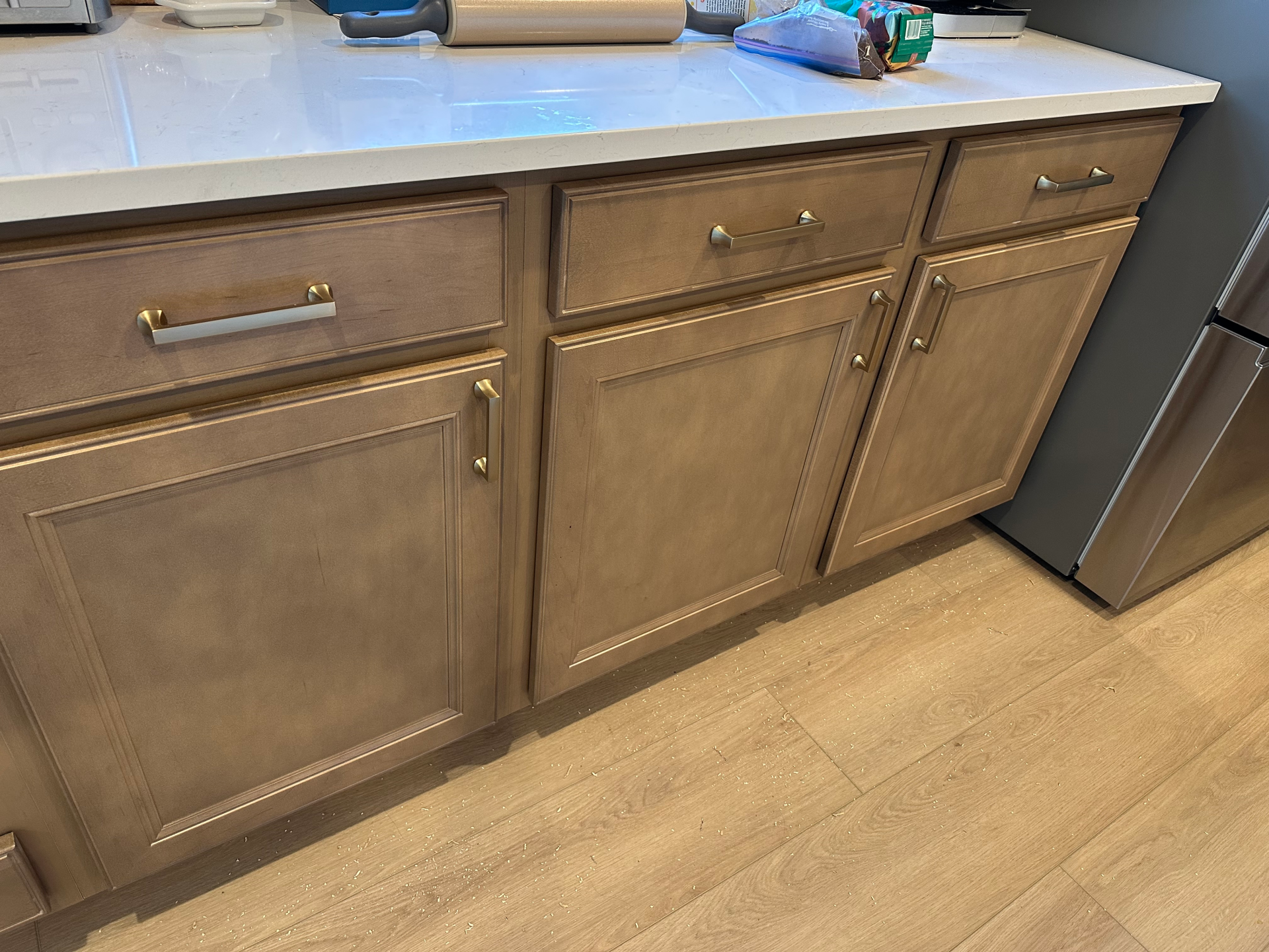 Install 58 cabinet handles and pulls in a kitchen and two bathrooms