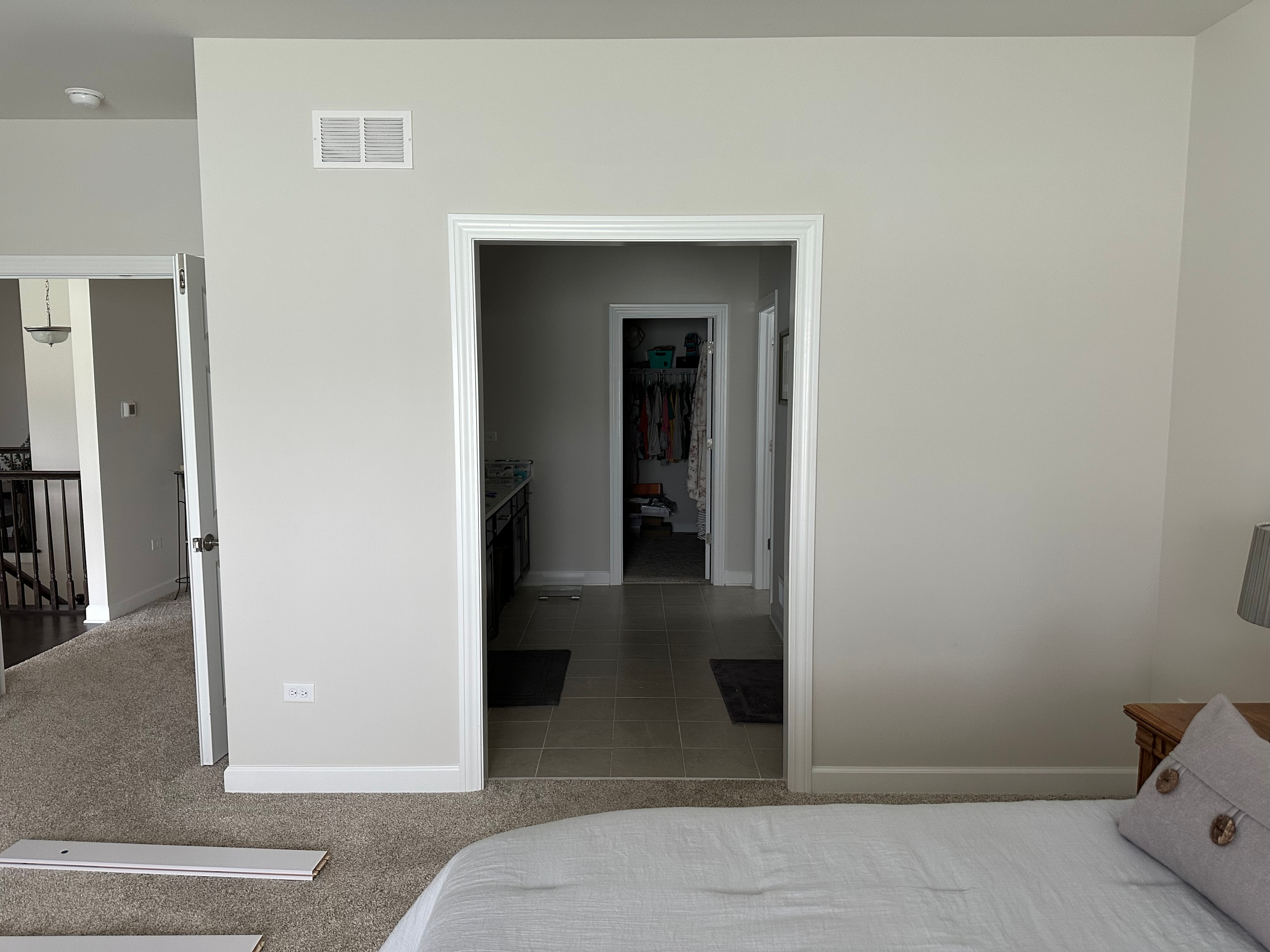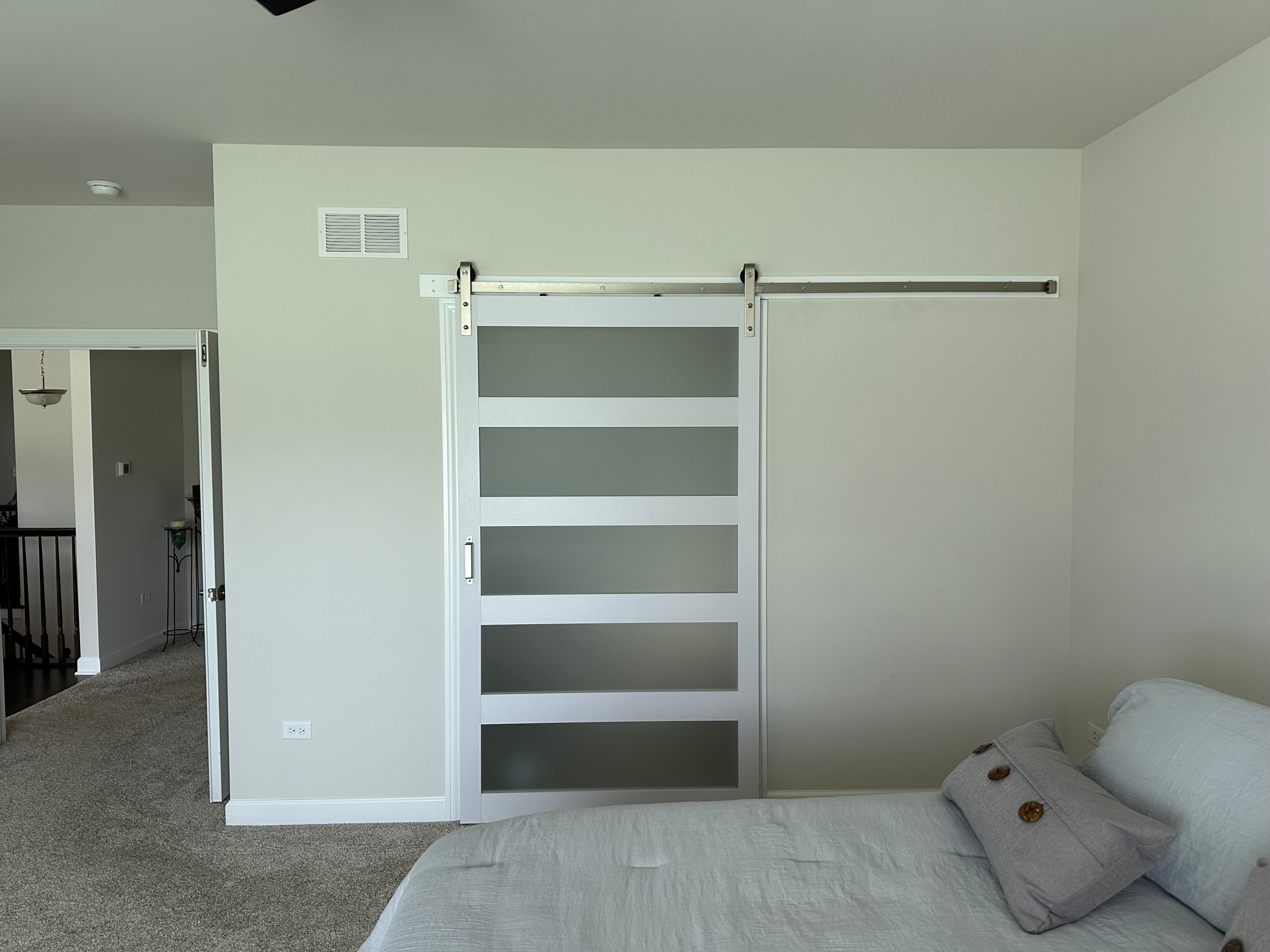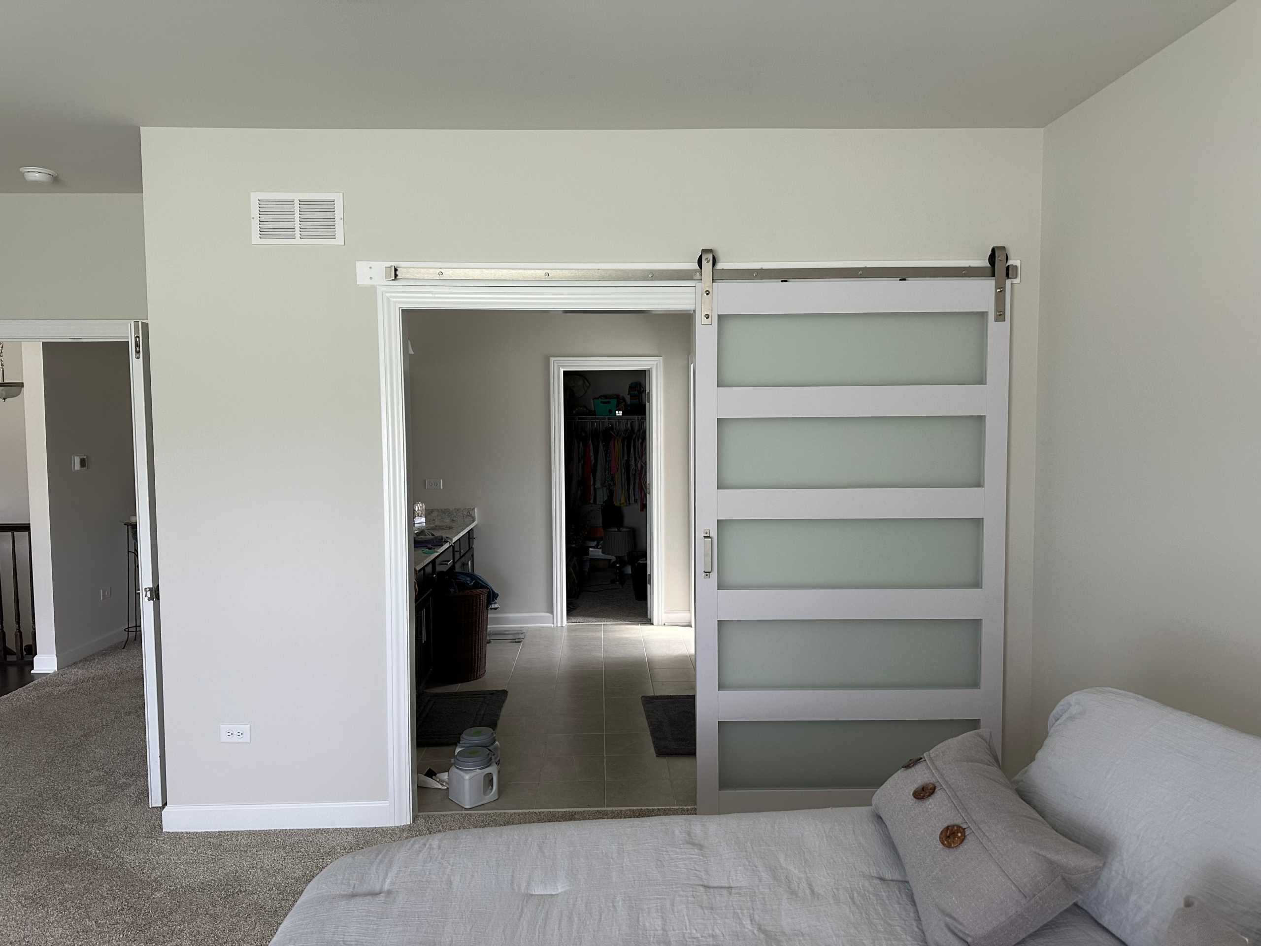 Assembly and installation of sliding barn door between bathroom and primary bedroom in new construction home
