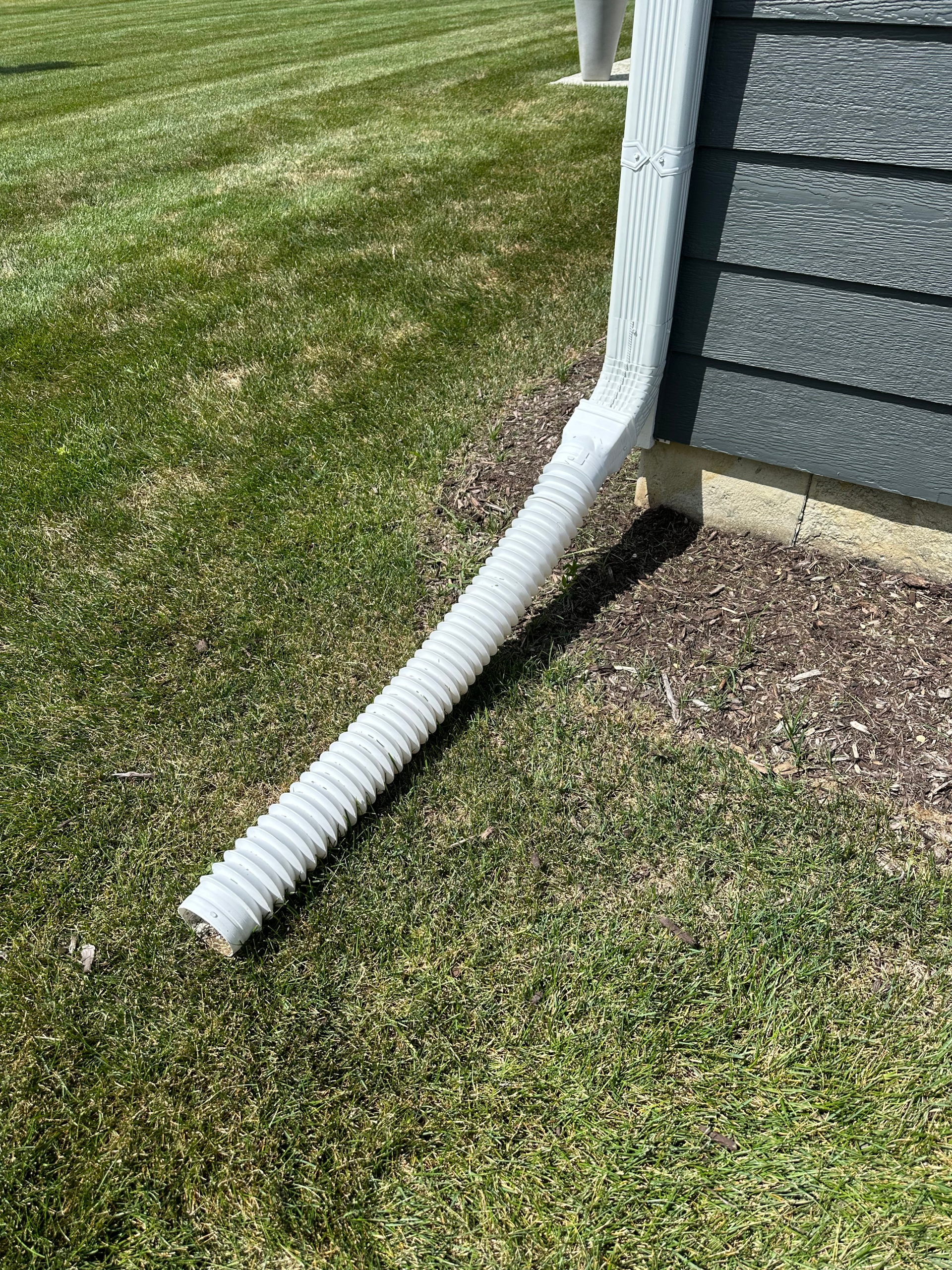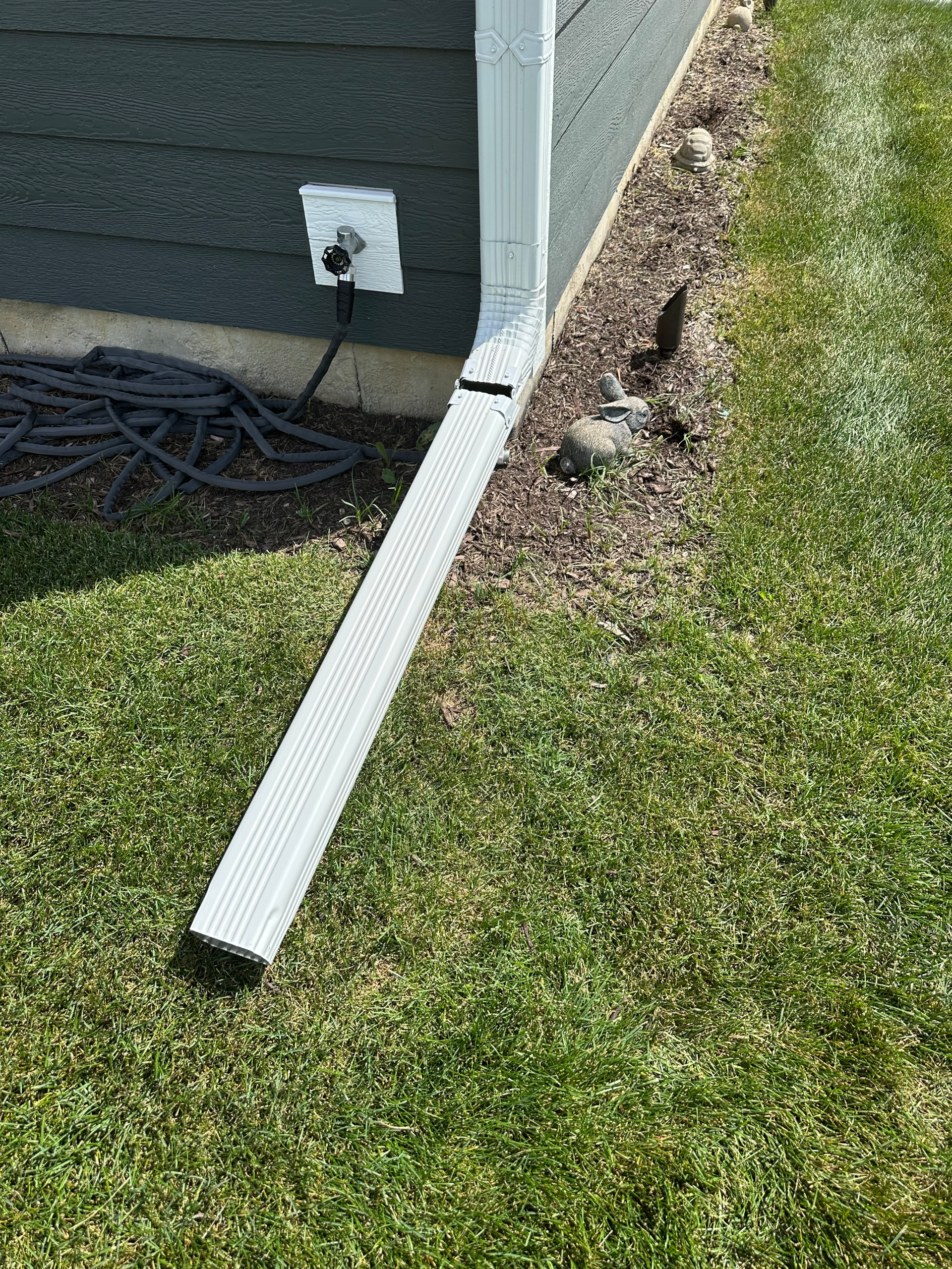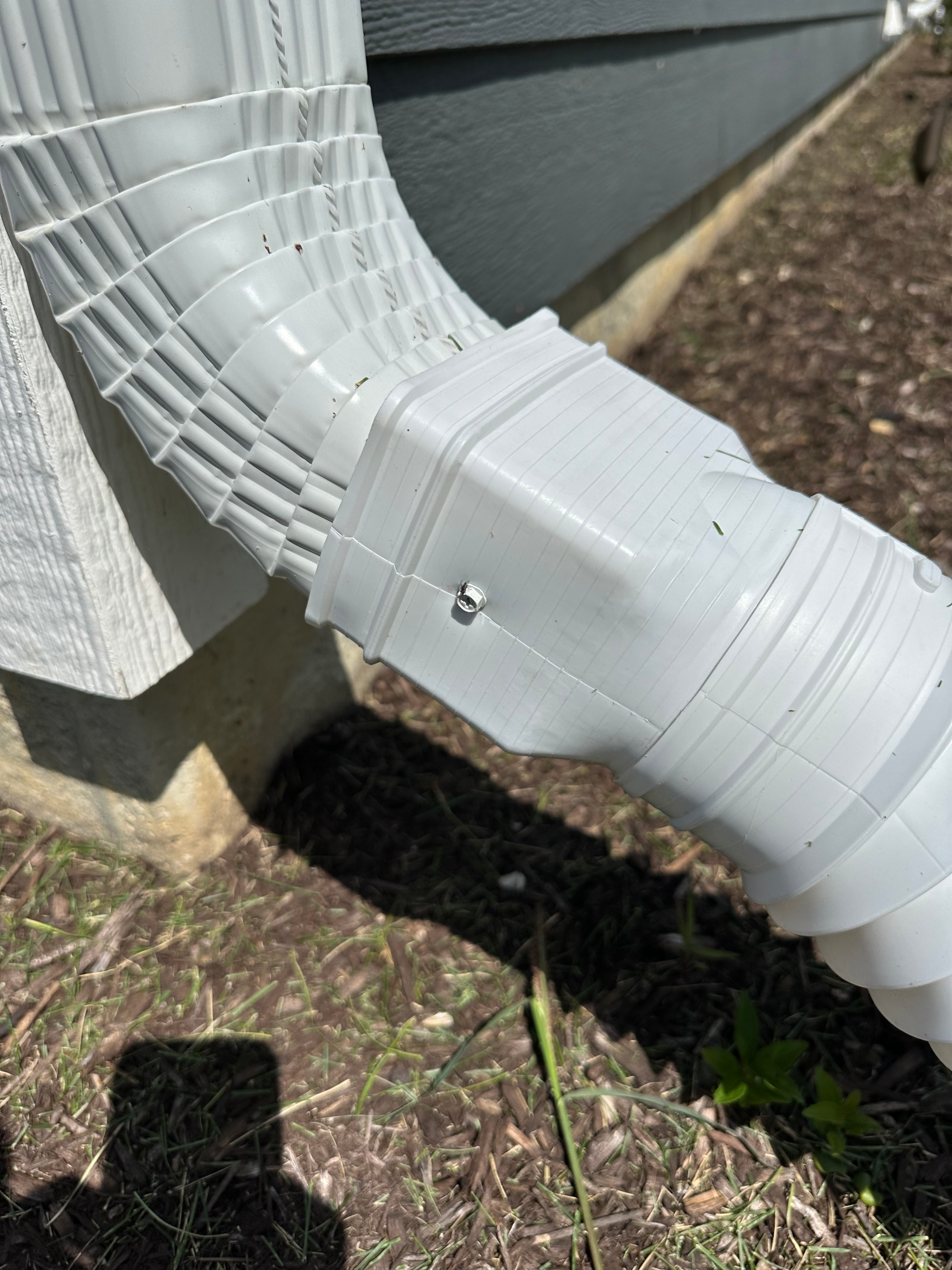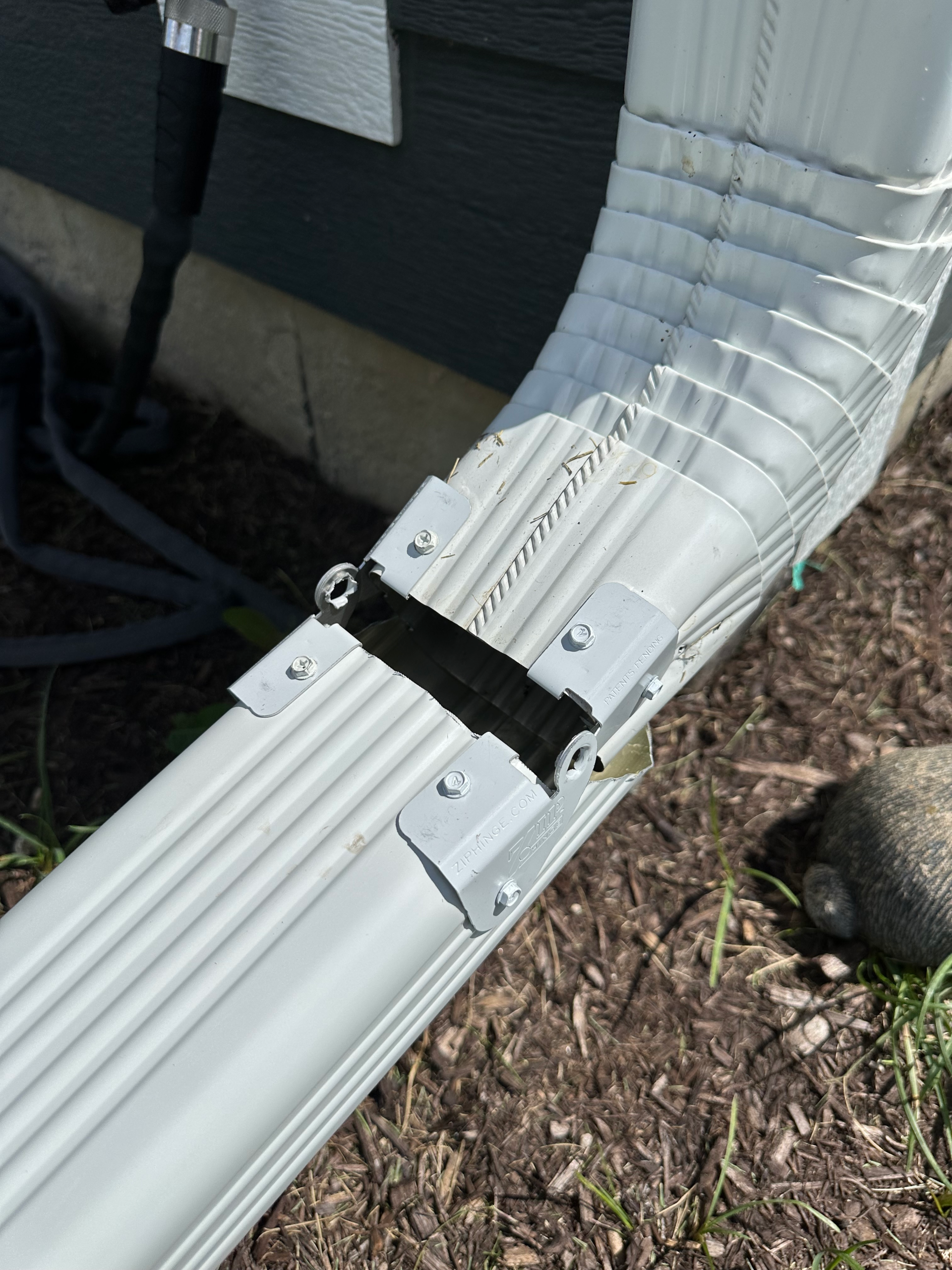 The client wanted to replace plastic downspouts that were being cut up by landscaping crews and equipment. I installed aluminum downspouts and Zip-Hinge(TM) hinges to allow the downspouts to be lifted vertically and out of the way of the landscaping crews each week.