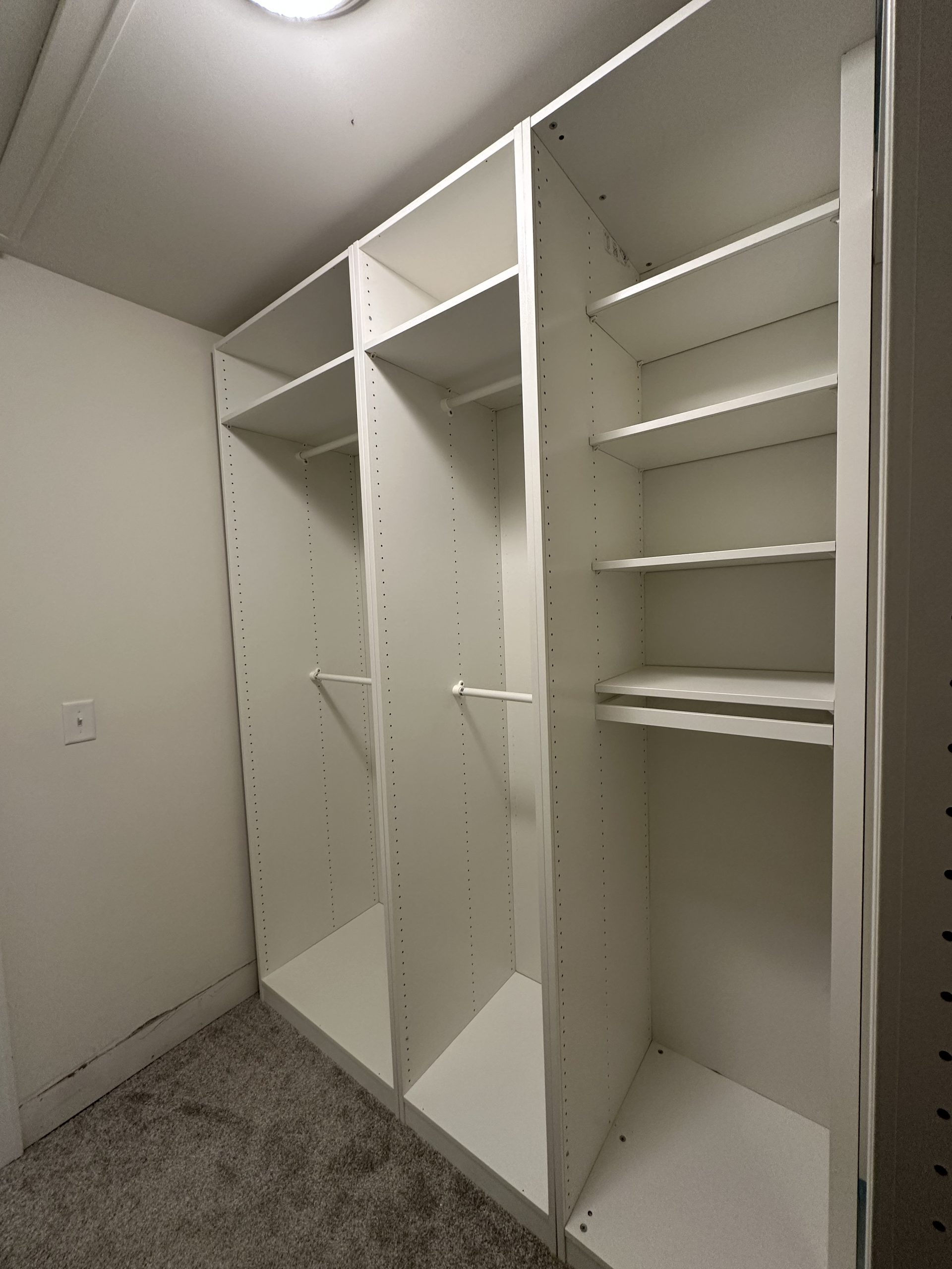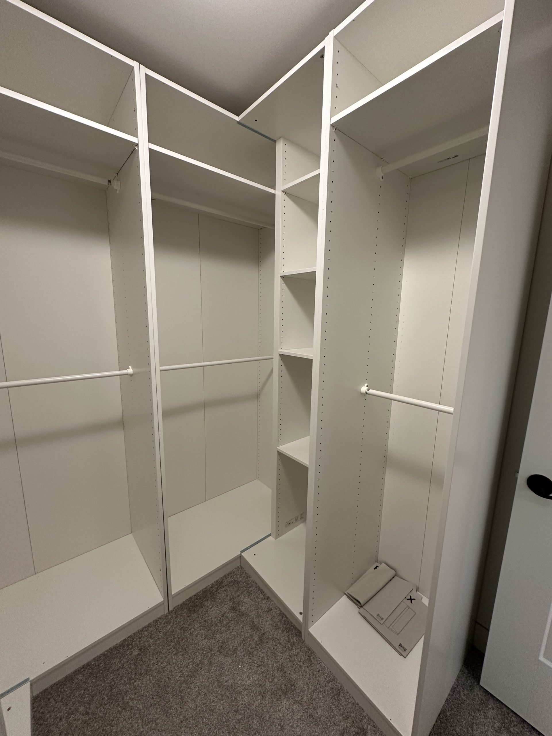 Complete walk-in closet outfitted with 7 PAX frames plus corner add-ons; also included full complement of shelves and clothes rails