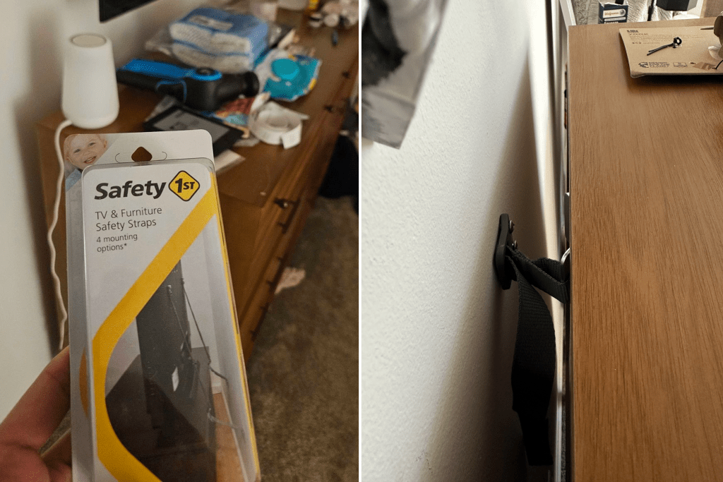 Babyproofing a bedroom by installing safety straps to the back of a tall, heavy dresser