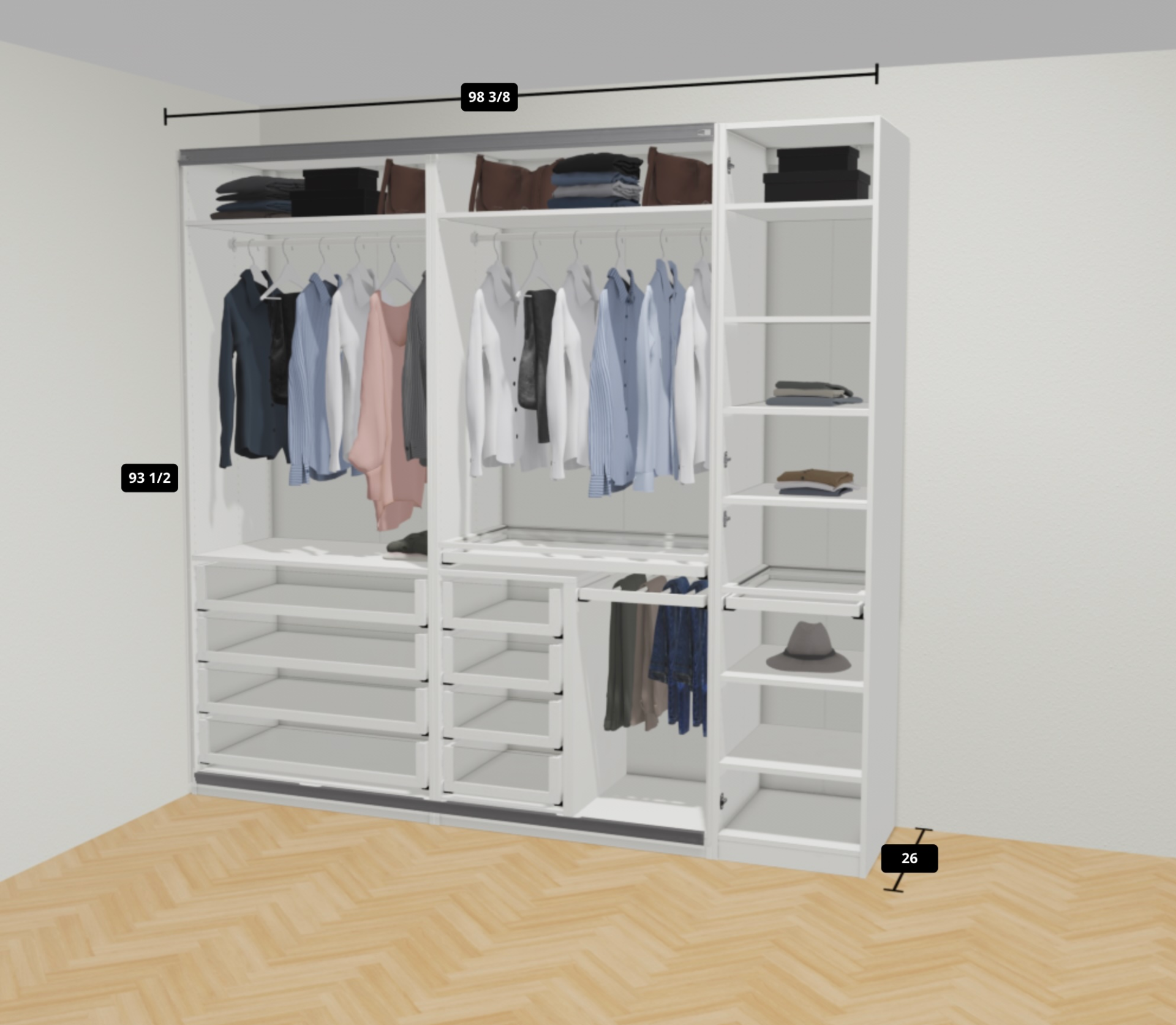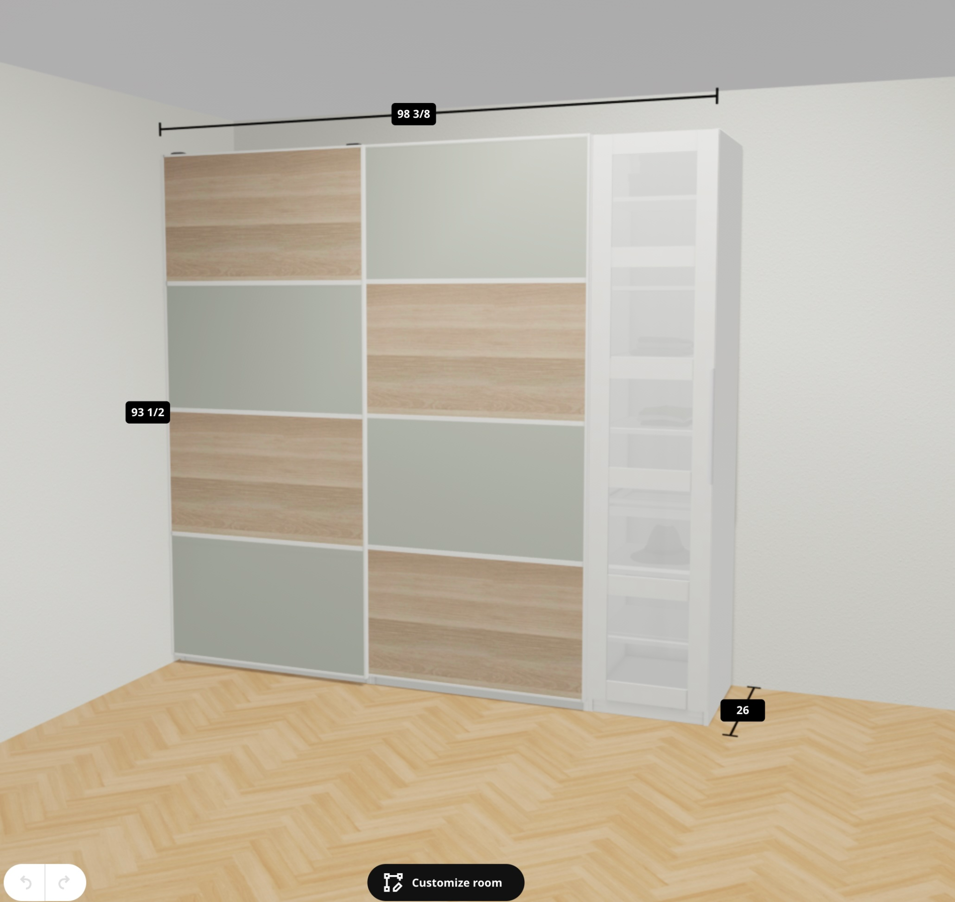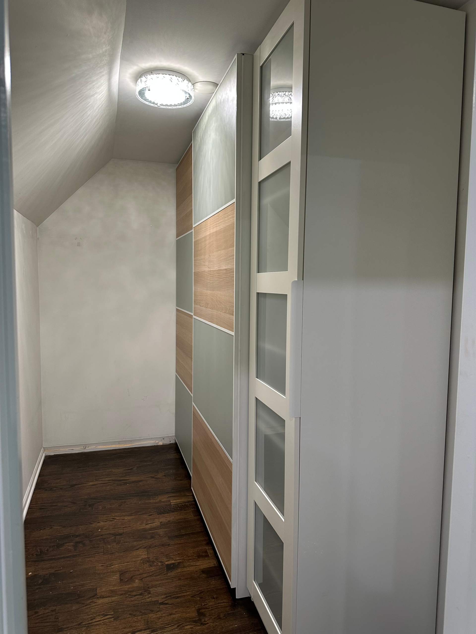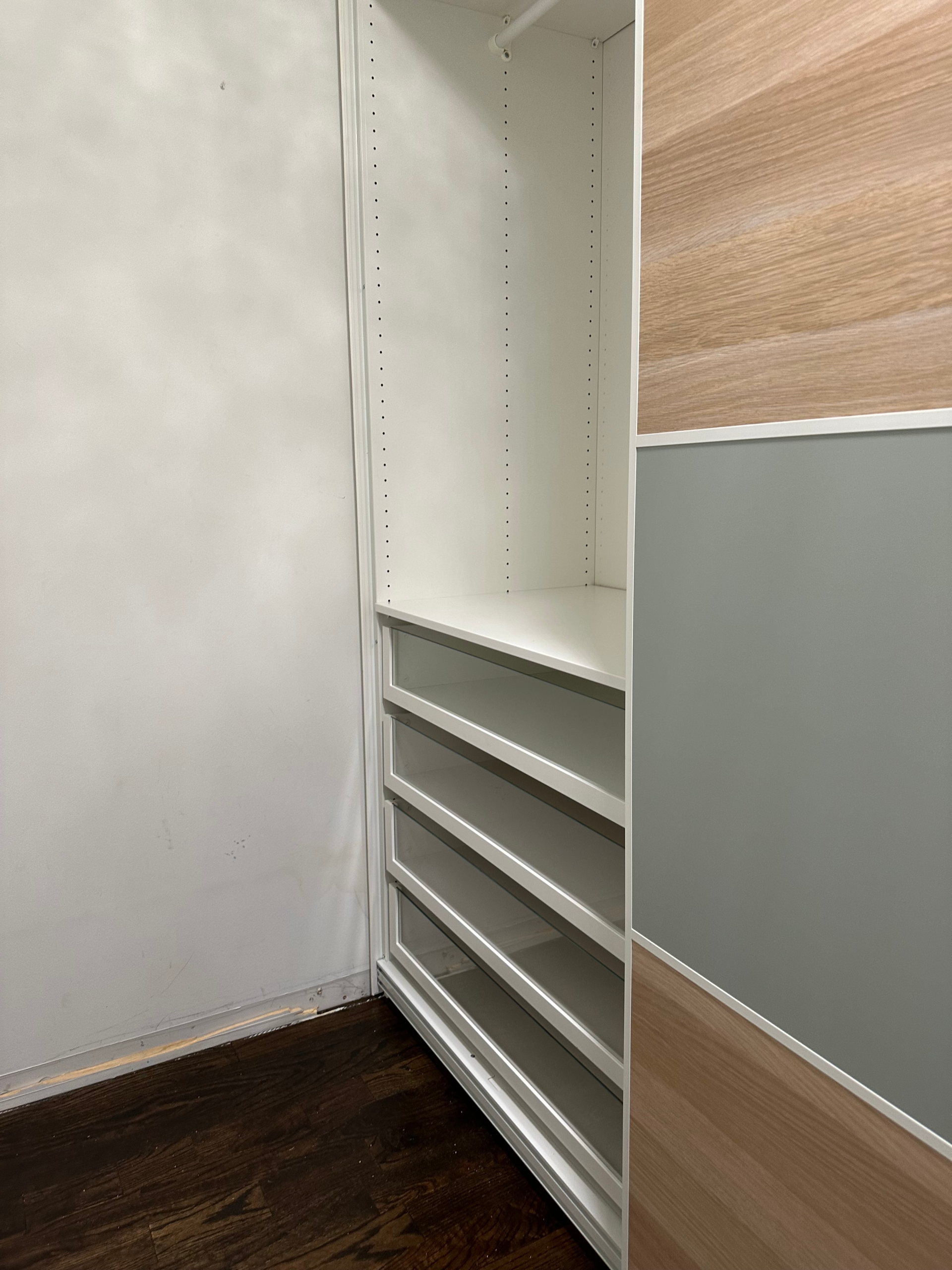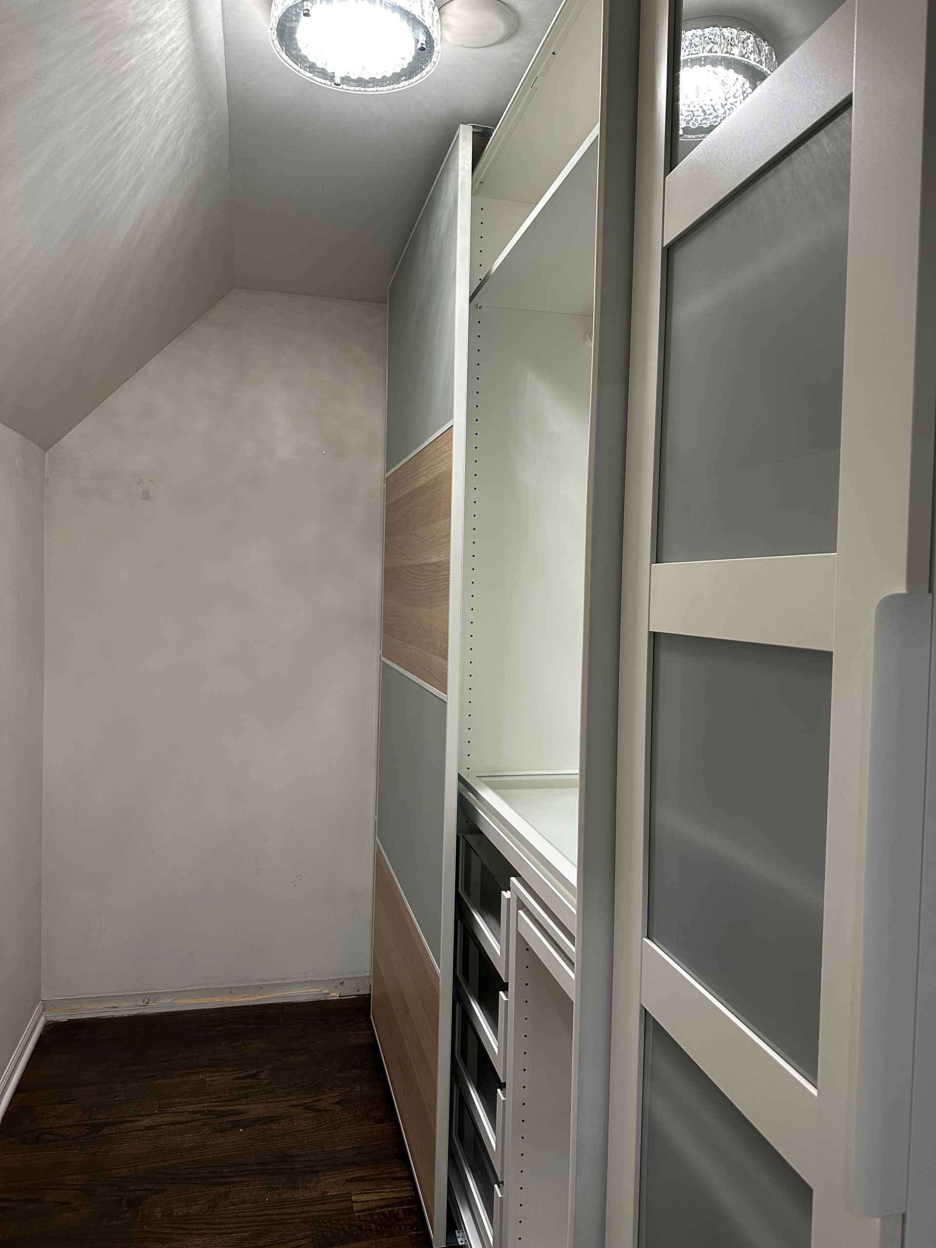 PAX wardrobe assembly with sliding doors in walk-in closet